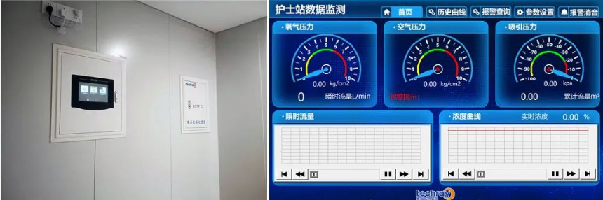 在每個科室護士站設(shè)置氣體壓力報警裝置,并在氣源值班室設(shè)置中央壓力監(jiān)測,確保氣源及末端均能第一時間了解氣體壓力異常情況,及時進行干預(yù)調(diào)配,確保全院用氣安全。