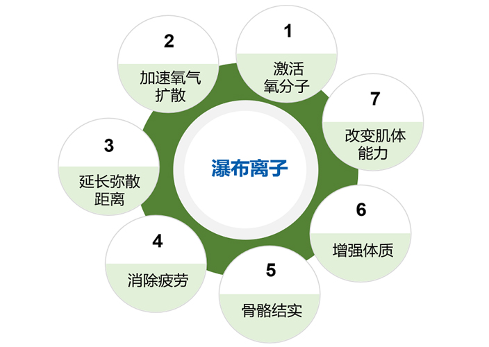 3、有效瀑布離子:激活空氣中的氧分子,延長(zhǎng)彌散距離,加速氧氣擴(kuò)散,使其更加容易被人體吸收。