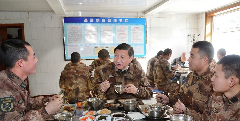 習(xí)近平主席來到內(nèi)蒙古軍區(qū)邊防某團一連食堂,同官兵一邊共進(jìn)午餐,一邊拉家常,了解士兵們衣、食、住、行等生活方面的問題。