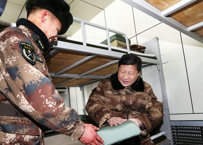 習(xí)近平主席在邊防某團一連視察戰(zhàn)士宿舍,關(guān)心士兵的住宿條件與生活環(huán)境。